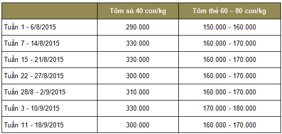 Tại Phú Yên, giá tôm tăng lên trong tháng 8, sau đó giám từ tuần thứ 2 của tháng 9.