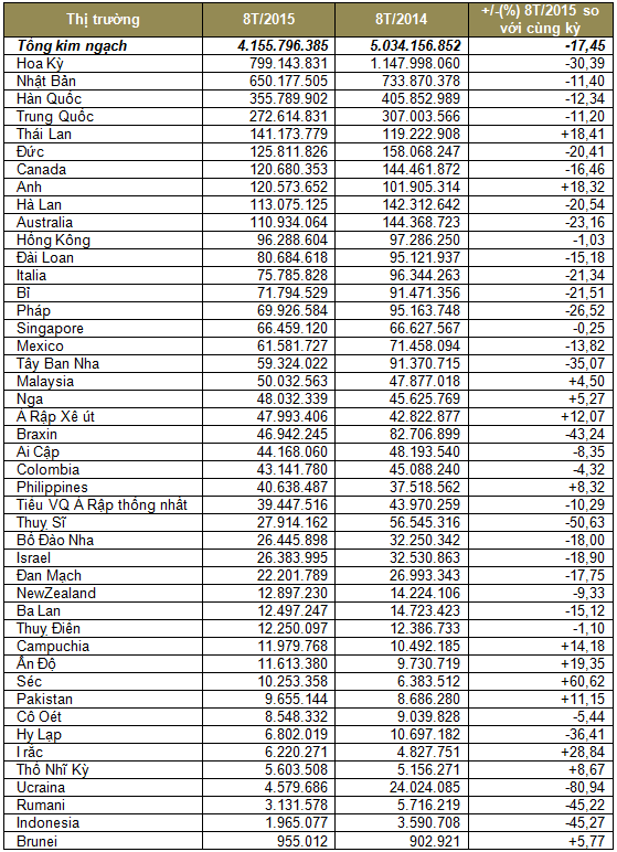 Bảng 3: Số liệu sơ bộ của TCHQ xuất khẩu thủy sản 8 tháng đầu năm 2015 - ĐVT: USD