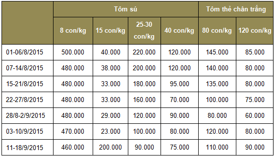 Tại Khánh Hòa giá tôm tăng dần từ tháng 8 đến mức cao nhất vào giữa tháng 8, sau đó giảm dần, đến trung tuần tháng 9 (từ 11/09 - 18/09) giảm mạnh, tôm sú loại 40 con/kg giảm 30.000 đồng/kg xuống mức 300.000 đồng/kg; tôm thẻ loại 60 - 80 con/kg cũng giảm 10.000 đồng/kg xuống mức 160.000 - 170.000 đồng/kg.